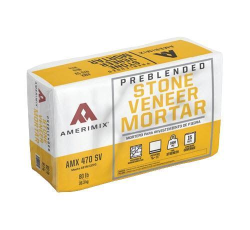 Amerimix AMX 470 SVM Stone Veneer Mortar is a pre-blended, high-performance mortar designed to set and grout artificial stone and brick veneers over concrete or masonry substrates.