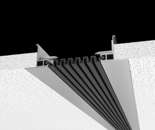 Ceiling expansion joint cover designed to attach to acoustical ceiling Tee framework. A variable elastomeric seal is fixed between two aluminum frames to provide thermal and seismic movement. Seals available in multiple color seals to blend with ceiling tiles.